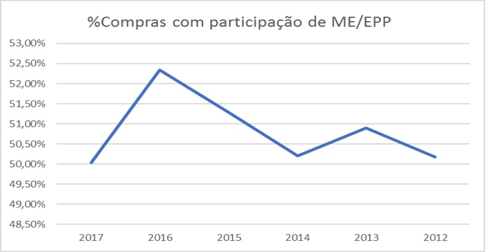 Quanto às compras públicas advindas de pequenas e medias empresas, verifica-se que, apesar da lei de incentivo ser de 2006, esta estabilizou e tem variação maior que 2% sempre ficando próximo aos 50 % das compras de 2012 a 2017 (figura 4).