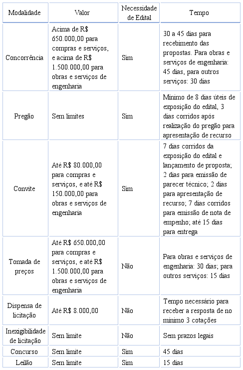 O Quadro 1 demonstra que cada modalidade conta com regras específicas, em especial quanto ao seu tempo de duração, que está relacionado aos níveis de complexidade – aquelas que envolvem maiores recursos e maiores tempos de publicação, com aquelas modalidades que dispensam o ato licitatório como um todo. É possível perceber que, quanto maior o valor que a licitação envolve, mais complexo e mais demorado o processo, a fim de garantir que todos os princípios constitucionais sejam cumpridos da melhor maneira possível.