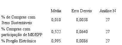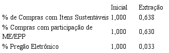 Para realizar a análise fatorial no SPSS foram utilizadas como base de dados as informações relacionadas ao processo de compra realizados por 27 estados (unidades federativas) nos seguintes quesitos: porcentagem de compras sustentáveis, porcentagem de compras de micro e pequenas empresas e a porcentagem de pregões do tipo eletrônico.