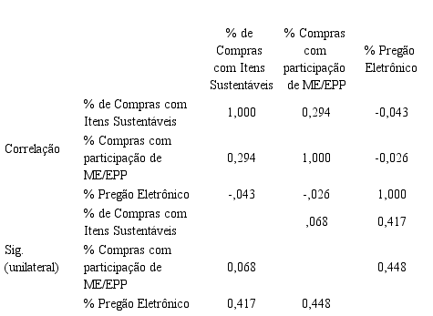 Por todos esses elementos, e contrariando uma “hipótese inicial”, pode-se afirmar que não existem elementos fortes o suficiente para afirmar uma relação entre os três elementos apresentados, como isso não é possível, questiona-se: a metodologia aplicada de fato é mais a adequada para análise pretendida? A amostra – integralidade das licitações no período – poderia ter um recorte? Por fim, o fato de o espaço temporal da amostra ser limitado aos dados disponíveis no portal governamental e o período das legislações sobre compras sustentáveis, pregão e compra de microempresas serem relativamente novas, dificultam estabelecer uma relação segura? De todas essas novas hipóteses que se levantam, os pesquisadores trabalham com mais afinco nesta última, fazendo novos testes estatísticos na tentativa de comprová-las.