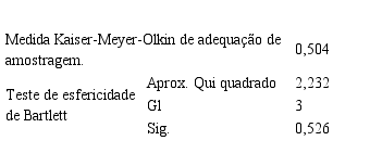Para testar a adequação do modelo de análise fatorial, geralmente utilizam-se a estatística de Kaiser-Meyer-Olkin (KMO) e o teste de esfericidade de Bartlett, que indicam o grau de ajuste dos dados à análise (tabela 3).