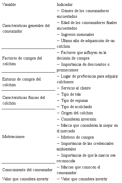 Para la recopilación de la información se estructuró una encuesta dirigida a los consumidores finales de colchones. Se recopiló información referente a los factores que inciden en el comportamiento de compra del consumidor por medio de 19 preguntas, identificándose aspectos como: características generales del consumidor, factores de compra que determinan su comportamiento, entorno de compra, motivaciones, preferencias, conocimiento del consumidor y las características físicas del colchón.