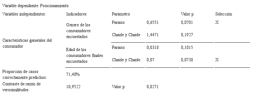 Se puede evidenciar que la proporción de casos correctamente predichos del modelo es del 71,40% y, según el test de razón de verosimilitudes, con un valor p significativo al 10% (0,0000), se determina que tanto el género como la edad de los compradores de colchones explican al posicionamiento que tienen las marcas Chaide y Chaide y Paraíso en el mercado.
