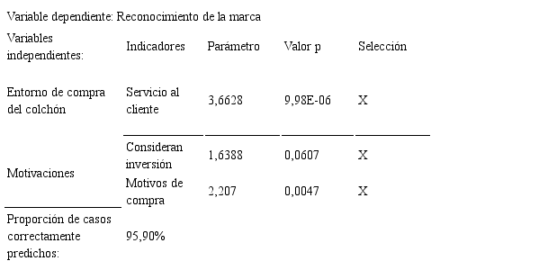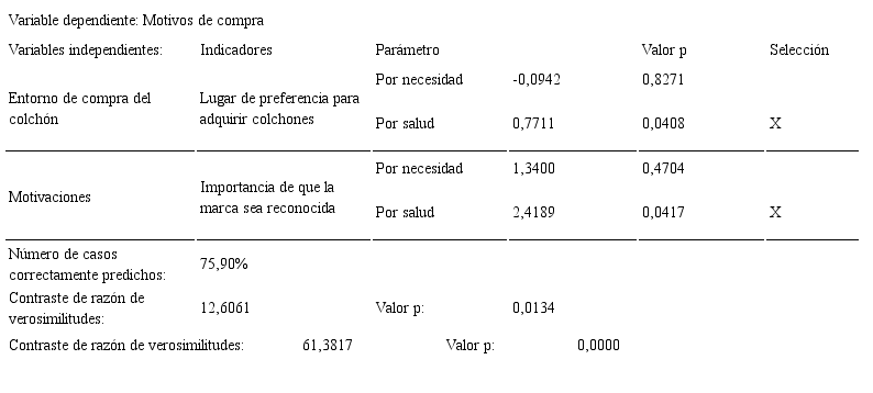 El modelo de motivos de compra (Tabla 7) muestra una proporción de casos correctamente predichos de un 75,90% y un valor p del test de razón de verosimilitudes significativo al 10% (0,0000). Esto muestra que el lugar de preferencia para adquirir colchones y la importancia de que la marca sea reconocida explican a los motivos de compra de los clientes por recomendación, por necesidad o por salud.