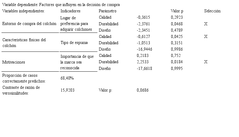 El modelo de los factores que influyen en la decisión de compra (Tabla 5) registra una proporción de casos correctamente predichos de un 68,40% y un valor p del test de razón de verosimilitudes significativo al 10% (0,0686), razón por la cual se determina que el lugar de preferencia para adquirir colchones, el tipo de espuma y la importancia de que la marca sea reconocida explican a los factores que influyen en la decisión de compra, como es el precio, la calidad, la durabilidad y el diseño.