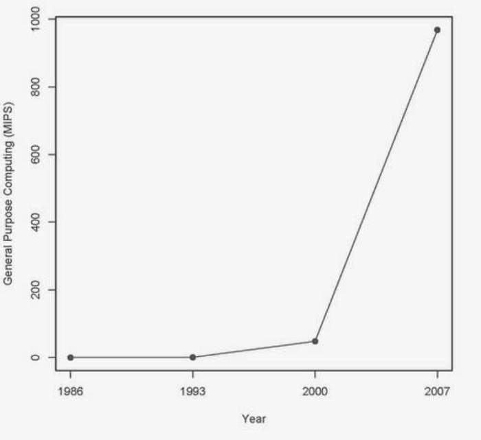 Martin Hilbert, em seu artigo intitulado “The World’s Technological Capacity to Store, Communicate, and Compute Information”, de 2011, comenta acerca da análise de que a capacidade de computação de propósito geral cresceu a uma taxa anual de 58%. A capacidade mundial de telecomunicações bidirecionais cresceu 28% ao ano, seguindo proximamente o aumento da informação armazenada globalmente (23%). A capacidade da humanidade para difusão de informação unidirecional por meio de canais de transmissão experimentou um crescimento anual comparativamente modesto (6%). A telecomunicação tem sido dominada por tecnologias digitais desde 1990 (99,9% em formato digital, em 2007) e a maioria da memória tecnológica tem sido produzida em formato digital, desde o início dos anos 2000 (94% digital, em 2007).