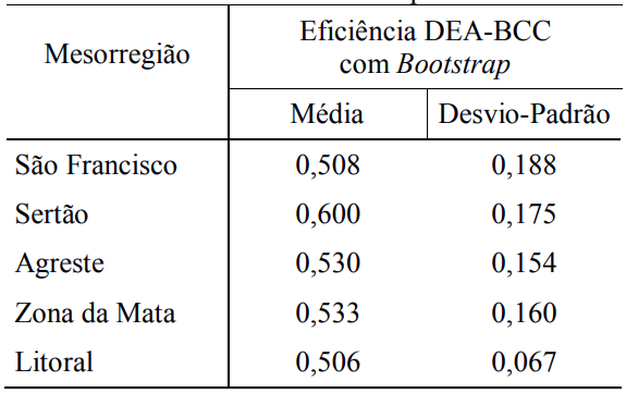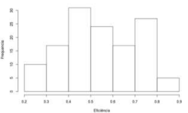 Os dados coletados das variáveis foram utilizados na mensuração da eficiência dos sistemas de saúde por meio do DEA com bootstrap. Os indicadores foram classificados da seguinte forma: 1º quartil com 0,4219, ou seja, municípios com indicadores inferiores a 0,4219 são considerados piores e o 3º quartil com 0,6920, em outras palavras, municípios com indicadores superiores ao valor de 0,6920 foram considerados como de melhor eficiência. A Tabela 2 apresenta as estatísticas descritivas por mesorregião do estado e a Figura 1 o histograma do indicador de eficiência dos sistemas de saúde dos municípios.