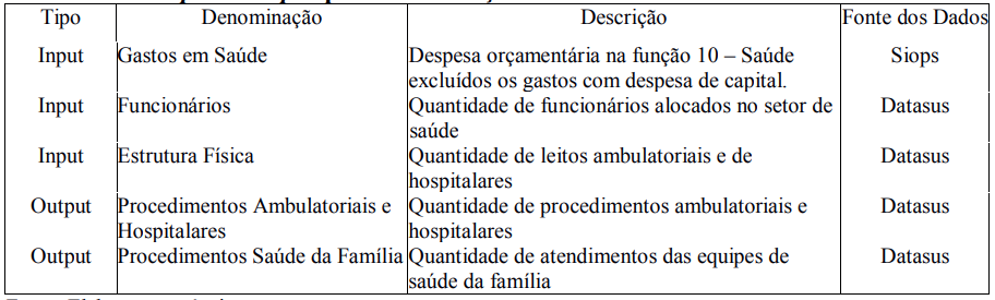 O indicador obtido pelo DEA representa a eficiência para cada município (UTM). Entretanto, a DEA é sensível à composição da amostra e, para obter maior consistência e reduzir seus efeitos, os indicadores foram submetidos a bootstrap de 10 mil reamostragens com reposição (Simar & Wilson, 1998). Os indicadores de eficiência ajustados por bootstrap foram utilizados para escolha dos municípios participantes das entrevistas com os secretários municipais de saúde. As variáveis inseridas como inputs e outputs no DEA-BCC estão definidas no Tabela 1 a seguir:
