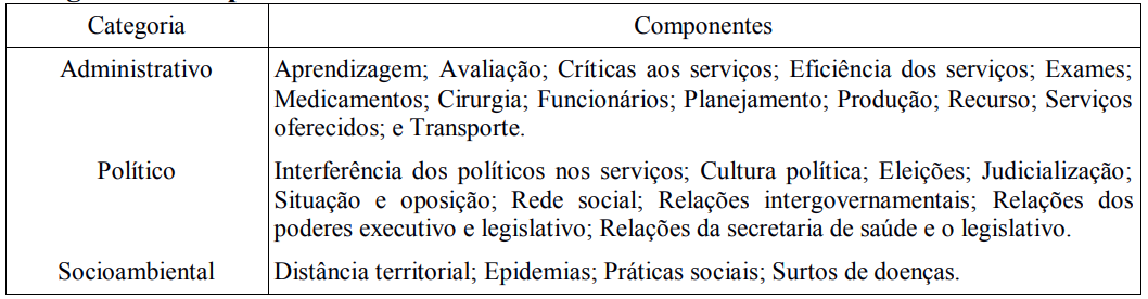 O tratamento das entrevistas foi realizado com uma leitura flutuante nas transcrições das entrevistas, de modo a identificar possíveis componentes e categorias, já que este estudo inova com essa abordagem. Em seguida, a codificação foi realizada com a segregação dos 25 componentes identificados em três categorias: administrativa; política e socioambiental. O Tabela 2 descreve as categorias e componentes, conforme segue: