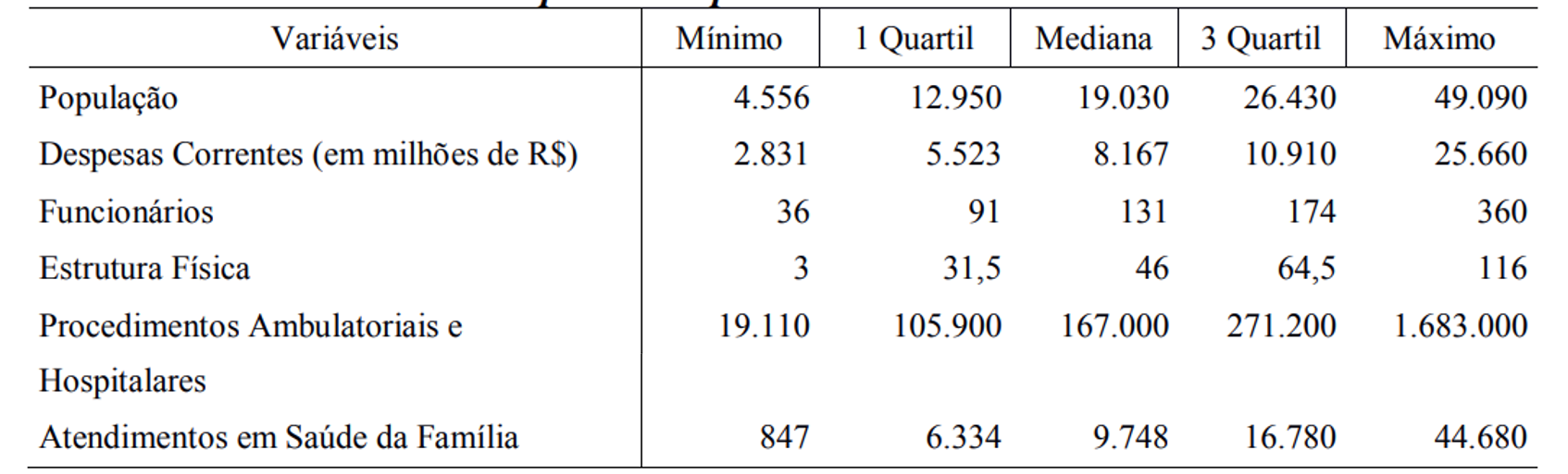 A Tabela 3 apresenta as estatísticas descritivas das variáveis população, despesas correntes, quantidade de funcionários, estrutura física, quantidade de procedimentos ambulatoriais e hospitalares e a quantidade de atendimentos na saúde da família, conforme segue: