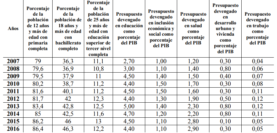 La educación en el Ecuador ha evolucionado positivamente durante el período de 2007 a 2016, especialmente en lo que se refiere a la educación secundaria, puesto que la proporción de la población de 18 años y más de edad con bachillerato completo presentó el mayor crecimiento de todos los niveles educativos. El mayor efecto que ha tenido la inversión social, en general, ha sido percibido por la educación secundaria y es rescatable el rendimiento que ha tenido el gasto público en términos de mejoramiento de la educación a este nivel. El rendimiento educativo, especialmente en los niveles primario y secundario, han mantenido una evolución similar, tales aspectos dependerían de ciertas circunstancias que relacionan la inversión social en general con la educación en el Ecuador. La culminación educativa en todos sus niveles dependería de la capacidad que tengan los ciudadanos para asistir a clases en lo que la salud juega un papel trascendental.