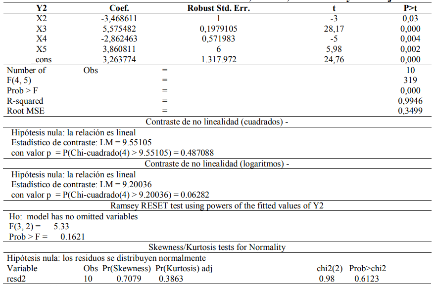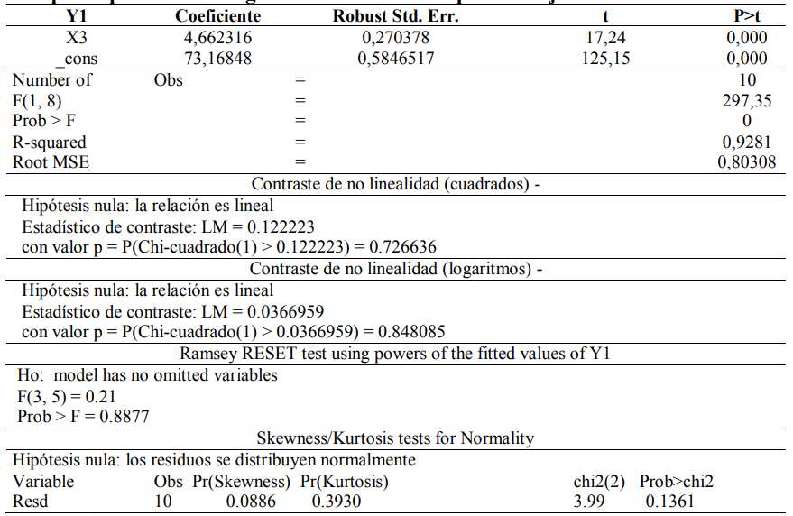 La relación existente entre las variables antes mencionadas es lineal dado que se descartó mediante el contraste de no linealidad, tanto para cuadrados como para logaritmos, la necesidad de expresar de manera polinomial o logarítmica a la regresada o a las regresoras del modelo. El valor p del estadístico Chi-cuadrado para el contraste de no linealidad en cuadrados fue de 0,48088, no significativo al 5%, por lo que se acepta la hipótesis nula de que la relación es lineal; no se requiere expresar a ninguna de las variables explicativas en su forma cuadrática para especificar la regresión. De igual forma, el valor p correspondiente al estadístico del contraste de no linealidad en logaritmos tampoco fue significativo al 5%, siendo este de 0,0628, con lo cual se acepta la hipótesis nula de relación lineal; es decir, no es necesario estimar logaritmos para definir correctamente la correspondencia entre las variables consideradas en el modelo.