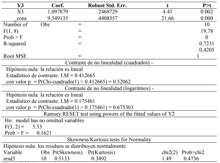 Se evidenció la existencia de una correspondencia lineal entre las variables sujetas a análisis tanto en cuadrados como en logaritmos. El contraste de no linealidad para cuadrados evidenció un valor p para una distribución Chi-cuadrada de 0,5206, mismo que no es significativo, por lo cual se acepta la hipótesis nula de relación lineal entre las variables. Los resultados de este análisis comprueban el hecho de que no se requiere especificar el modelo de regresión acorde a una expresión polinómica; es decir, no se requiere considerar a la variable independiente en su forma cuadrática o cúbica para estimar la regresión propuesta. De igual manera, el estadístico de Chi-cuadrado registró un valor p no significativo para el test de no linealidad en logaritmos (0,6753), razón por la cual se acepta que la relación existente entre las variables estudiadas es lineal, pues, de acuerdo con este resultado, se acepta la hipótesis nula que sustenta esta afirmación; tampoco se necesita aplicar logaritmos a las variables estudiadas.