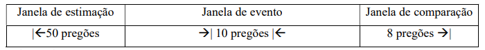 Na primeira etapa de definição dos eventos, o dia da ocorrência é considerado a data zero, neste artigo de 09/11/2018. Para observar alguns dias dos períodos ex-ante e ex-post, ao redor da data zero é utilizada uma janela de eventos; a janela de estimação é composta pelos dias anteriores ao início da janela do evento e a janela de comparação pelas datas posteriores ao dia do evento (Mackinlay, 1977; Camargos & Barbosa, 2006).