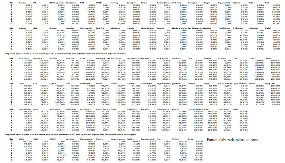 Conforme Tabela 1, observa-se que das 95 empresas, 34 tiveram p-value menor que 5%, demonstrando que estatisticamente podem existir indícios de um retorno anormal, o que comprovaria a HEM semiforte. Quarenta e oito empresas tiveram p-value maior que 5%, demonstrando que estatisticamente não houve retorno anormal. Treze empresas que tiveram p-value maior que 5% nos primeiros dias, após alguns dias, verificou-se um efeito postergado.