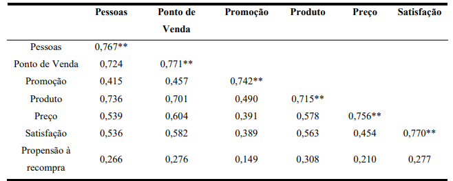 O construto Propensão à recompra possui somente um item. Por isso não foi necessária a realização da AFE nem a mensuração do A.C. e da AVE. Somente a correlação desse construto com todos os outros construtos é que foi realizada.