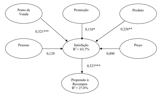 No caso da Satisfação, existe uma influência significativa positiva de outros três construtos (Produto, Promoção e Ponto de venda). Por conseguinte, quanto maior forem esses construtos, maior será a percepção de satisfação por parte dos consumidores. Os construtos pessoas e preço não influenciam de forma significativa o construto satisfação. Juntos, todos os construtos citados explicam 63,7% da variabilidade do fator satisfação.