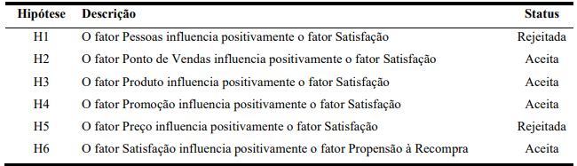 Em relação às seis hipóteses apresentadas, quatro foram confirmadas. Os construtos Ponto de Venda, Produto e Promoção têm influência positiva sobre a satisfação, que por sua vez influencia a Propensão à Recompra.
