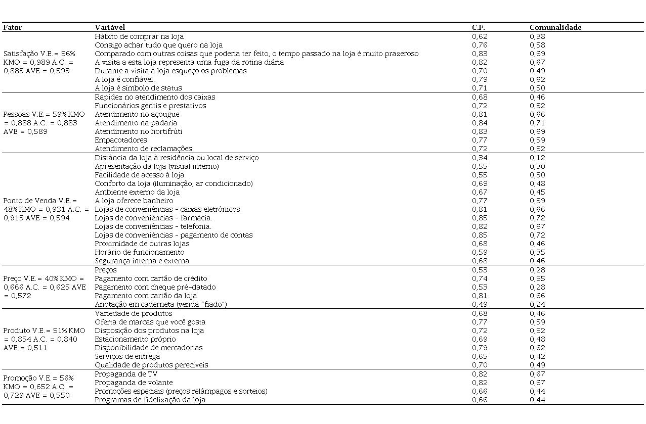 Nota-se que os fatores Ponto de Venda e Preço apresentaram VE abaixo de 50% e itens com carga fatorial abaixo de 0,50, que devem ser retirados da análise fatorial para possibilitar um bom ajuste do modelo de mensuração. Dessa forma, os itens Distância da loja à residência ou local de serviço (Ponto de Venda) e Anotação em Caderneta (Preço) foram excluídos de seus respectivos construtos.