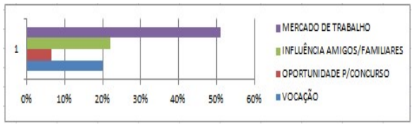 Quanto à pergunta sobre motivação do curso, mais da metade da amostra (equivalente a 51% dos alunos) informaram que optaram pelo Curso de Ciências Contábeis com base nas possibilidades diversificadas de atuação no mercado de trabalho; 22% por influência de amigos e familiares; 7% dos alunos escolheram o curso para se prepararem e, em uma oportunidade de concurso, estar aptos e, apenas 20% por vocação, tais dados estão explanados na Figura 4.