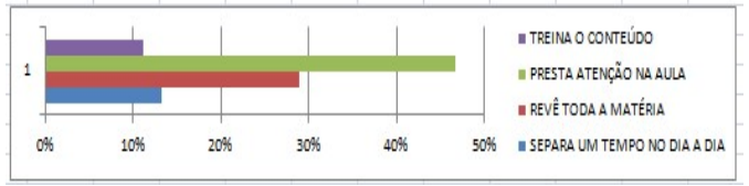 No tocante à forma como o aluno se organiza para estudar, conforme evidenciado na Figura 6, verificou-se que, na amostra escolhida, 47% dos alunos informaram prestar atenção nas aulas e fazer anotações do assunto abordado; 29% dos alunos reveem toda a matéria às vésperas das provas; 13% dos alunos separam um tempo do seu dia a dia com o propósito de estudar e 11% dos alunos treinam o conteúdo aprendido com exercícios.