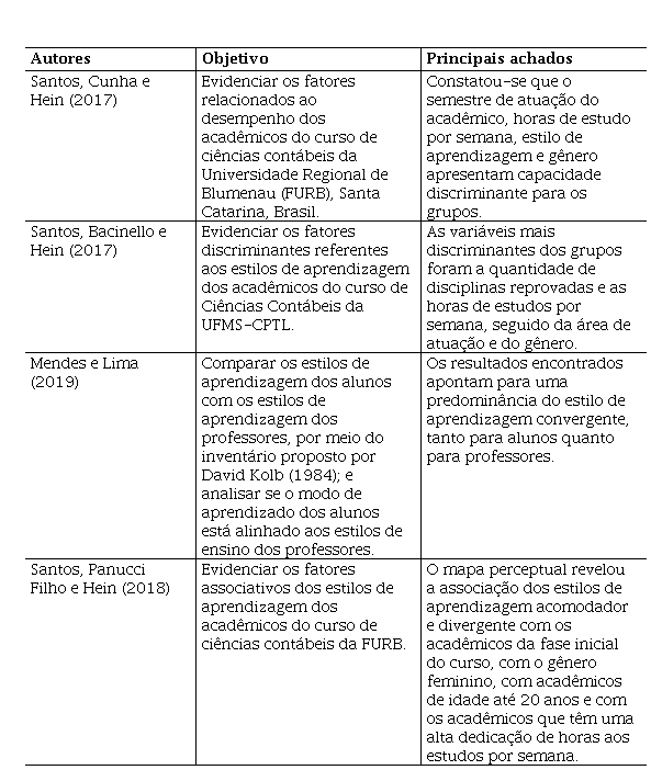 Com o propósito de verificar os estilos de aprendizagens, assim como analisar o nível de maturidade do tema na academia, foram realizados diversos estudos evidenciados na Tabela 1, neles são transcritos os objetivos e resultados expostos pelos mesmos. Na primeira coluna é identificado cada autor e ano da obra apresentada; a segunda coluna é referente aos objetivos dos estudos de cada autor e a terceira coluna apresenta o resultado obtido pelos autores.