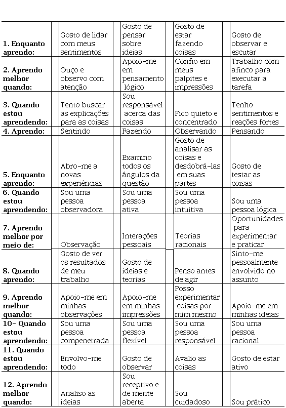 O Inventário de Estilos de Aprendizagem (IEA) permite identificar qual a preferência dos sujeitos entre as quatro habilidades propostas em seu modelo (Kolb, 1984). O instrumento possui doze conjuntos de afirmações, que inicialmente eram nove, com quatro possibilidades de resposta cada uma. Ao discente é solicitado hierarquizar cada uma dessas hipóteses de resposta, em cada conjunto de afirmações. Tem-se, na Figura 1, a combinação de quatro estágios, dois a dois e em sequência, gerando quatro estilos individuais de aprendizagem.