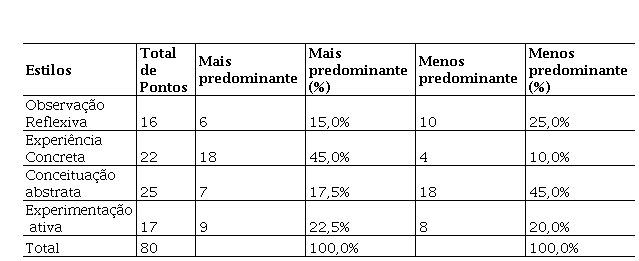 Após entrega dos questionários, todas as informações foram agrupadas em planilhas de Excel para contagem dos pontos que identificariam os Estilos de Aprendizagem de cada respondente. Considerando que o teste de Kolb tem quatro colunas, foram somados todos os escores separadamente e elaborada a planilha dos resultados obtidos. No total, todas as informações estão discriminadas na Figura 8.