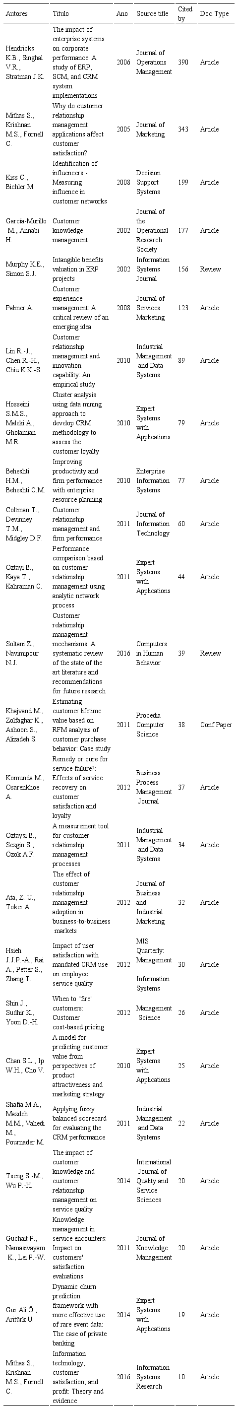 Procedendo-se à pesquisa bibliográfica, foi realizada uma busca sobre os documentos referentes ao ERP ou ao CRM, e que tratassem da satisfação do cliente. Assim a busca na base Scopus-Elsevier foi realizada utilizando como argumento: Título, Palavra-chave ou Resumo = (“Enterprise Resource Planning” OR “Client Relationship Management”) AND (“Customer Satisfation” OR “Client Satisfation”), limitada ao idioma Inglês.