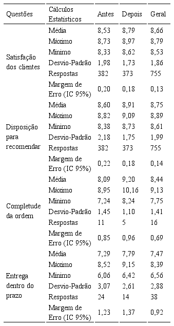 Entretanto, ainda que as médias das respostas tenham apresentado tendência de melhora, sob o ponto de vista estatístico, são consideradas iguais, pois os intervalos de confiança (95%) se superpõem.
