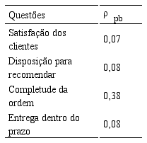 A Tabela 5 apresenta as correlações ponto bisseriais das questões selecionadas em relação à variável dicotômica da situação antes (0) e depois (1) da implementação dos sistemas ERP e CRM. As correlações das questões apresentaram coeficientes de correlação positivos, porém pouco significativos. A terceira questão, embora apresente correlação positiva moderada, apresentou apenas 16 respostas, inviabilizando seu aproveitamento.
