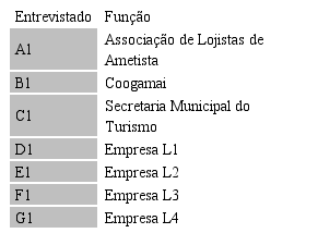 A pesquisa demandou um público específico – agentes e instituições que compõem a cadeia produtiva e que atuam enquanto promotores da comercialização nacional e internacional do setor. Diante disso, foram realizadas entrevistas, conforme a Tabela 1, sendo estas gravadas e posteriormente transcritas para fins de análise.