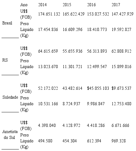 Ainda sobre os dados visualizados na Tabela 1, vale comparar os valores arrecadados (U$$) e o peso líquido exportado entre os municípios de Soledade e Ametista do Sul, com isso, é possível verificar que Soledade é a grande detentora dos índices de exportação, no entanto, é em Ametista do Sul que está localizada a maior produção de pedras preciosas do estado, porém, os dados apontam diferença em virtude de o município não realizar o beneficiamento dessa produção, enviando a Soledade.