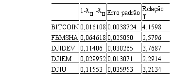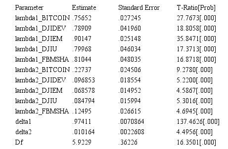 Foi executada análise M-GARCH-DCC nos retornos do Bitcoin e todos os 4 retornos do índice de ações. As figuras 1 e 2 ilustram os resultados. Os resultados do Modelo Normal DCC e do modelo t-DCC são comparados para determinar o melhor modelo. Os parâmetros de volatilidade observados no Modelo Normal DCC são altamente significativos com sua alta relação t e mostram o decaimento da volatilidade com seu λ1i, i = 1,2,3,4,5,6 próximo a 1. Volatilidades incondicionais estimadas e correlações são relatadas dentro do painel inferior.