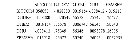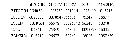 Como pode-se observar no gráfico, as volatilidades condicionais do Bitcoin atingiram o pico em 2013 e continuaram a flutuar de forma volátil no longo prazo, em comparação com os índices de ações islâmicos. O gráfico também confirma o que foi mostrado na matriz de volatilidade incondicional anteriormente que os retornos do Bitcoin exibiram as maiores volatilidades em comparação com outros índices durante todos os períodos. Nunca a volatilidade do Bitcoin foi menor do que outros índices. No entanto, pequenos picos na volatilidade do DJI Emerging Market podem ser vistos em meados de 2013 e meados de 2015, que também afetaram as volatilidades da Bitcoin, provando assim sua correlação positiva. Todos os outros índices, exceto o DJI Emerging Markets, têm correlação negativa com o Bitcoin.