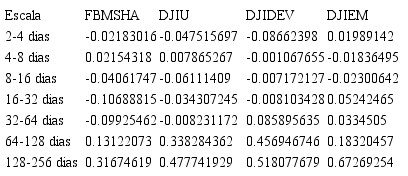 Para a correlação, o coeficiente de correlação Wavelet, ρXY (λj), fornece uma medida padronizada da relação entre as duas séries temporais submetidas a várias escalas de tempo. O estimador não viesado da correlação Wavelet para a escala de tempo j é definido por: