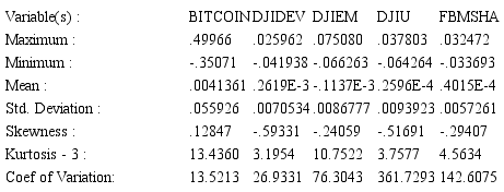 Estando altamente correlacionados entre si, também não chegou a surpreender que a menor correlação seja entre os retornos do índice Bitcoin com DJI Europe e DJI Development, que é de –0,028. A partir daqui, observamos que o Bitcoin será um excelente instrumento de diversificação, pois sua correlação com todos os outros índices islâmicos neste estudo é extremamente baixa em comparação com as correlações entre os índices de ações. Isso mostra que os investidores islâmicos podem se beneficiar da diversificação de seus investimentos além do mercado acionário e da criptomoeda, ou seja, o Bitcoin.