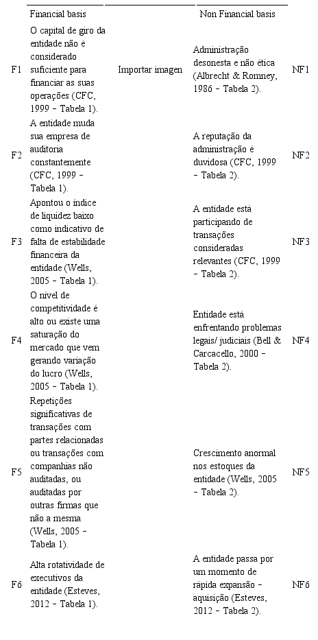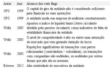 O resultado da pesquisa bibliográfica apontou para vários red flags, utilizados para percepção de erros e fraudes em demonstrações contábeis. Dentre eles, segundo o objetivo deste trabalho, destacam-se os apontados na Tabela 1. É preciso recordar que estes serão utilizados neste trabalho apenas em empresas públicas, logo, tanto a quantidade como o alcance ocorreram nesse sentido.