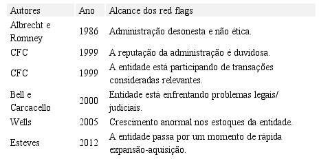 Logo, torna-se evidente que uma ocorrência de fraude interna está ligada a um ambiente propício ao seu surgimento, que pode ser identificado em tempo, quando utilizado pelas auditorias por meio dos chamados red flags (sinais de alerta). Conforme evidenciado nas pesquisas de Albrecht e Romney (1986), Eining et al. (1997), Bell e Carcacello (2000) e Wells (2005), os red flags são termômetros para detecção e prevenção de fraudes internas.
