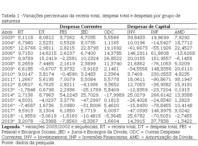 A Tabela 1 apresenta as variações percentuais da execução da receita orçamentária total realizada, a despesa orçamentária total e as despesas liquidadas correntes e de capital por grupo de natureza de despesa. Os conceitos/definições estão contidos na Portaria Interministerial (Secretaria do Tesouro Nacional e Secretaria de Orçamento Federal) nº 163, de 04 de maio de 2001 (Brasil, 2001).