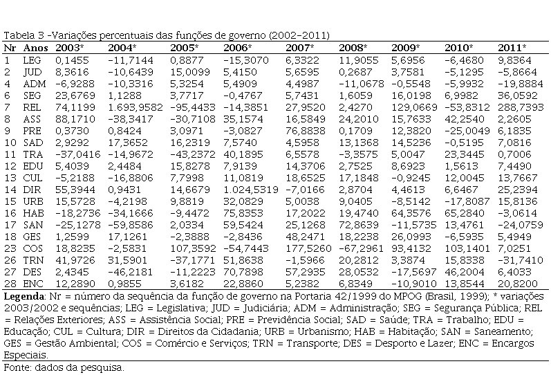 A Tabela 3 apresenta os resultados das variações percentuais das vinte despesas liquidadas por funções de governo no período de 2002 a 2011. Na primeira coluna consta o ano de 2003, com as variações registradas em relação ao ano de 2002 (base inicial do período de análise).
