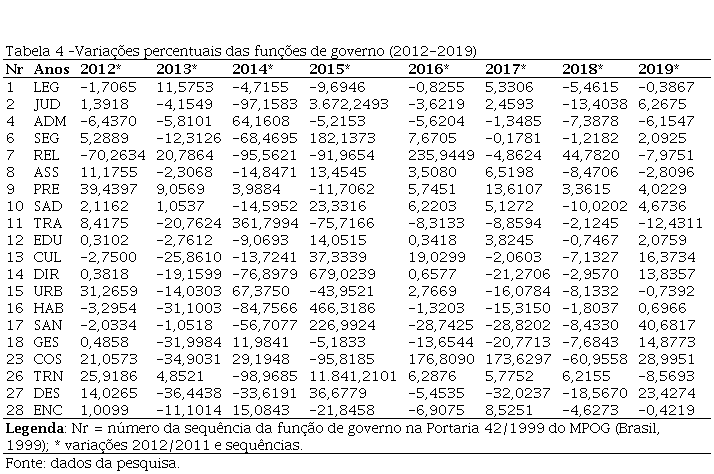 A Tabela 4 apresenta a continuidade dos resultados das variações percentuais das vinte despesas liquidadas por funções de governo no período de 2012 a 2019. Na primeira coluna consta o ano de 2012, com as variações registradas em relação ao ano de 2011.