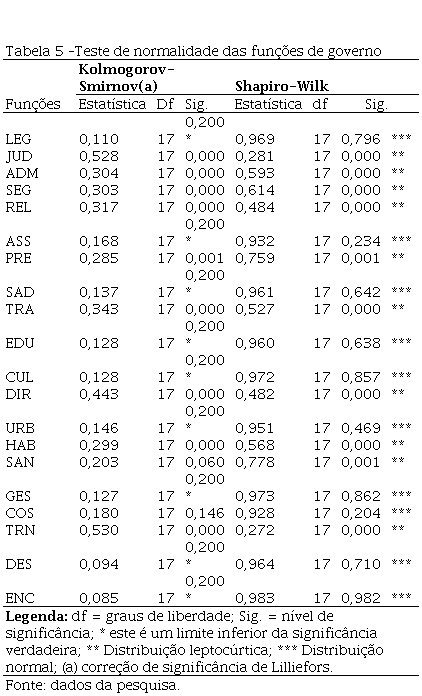 A Tabela 5 apresenta os resultados dos testes de normalidade das execuções das vinte despesas liquidadas por funções de governo das Tabelas 3 e 4.