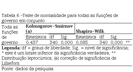 A Tabela 6 apresenta os resultados dos testes de normalidade das despesas liquidadas por funções de governo (forma conjunta, ou seja, das vinte funções de governo utilizadas como variáveis).