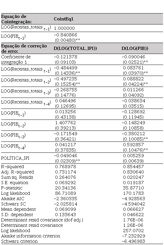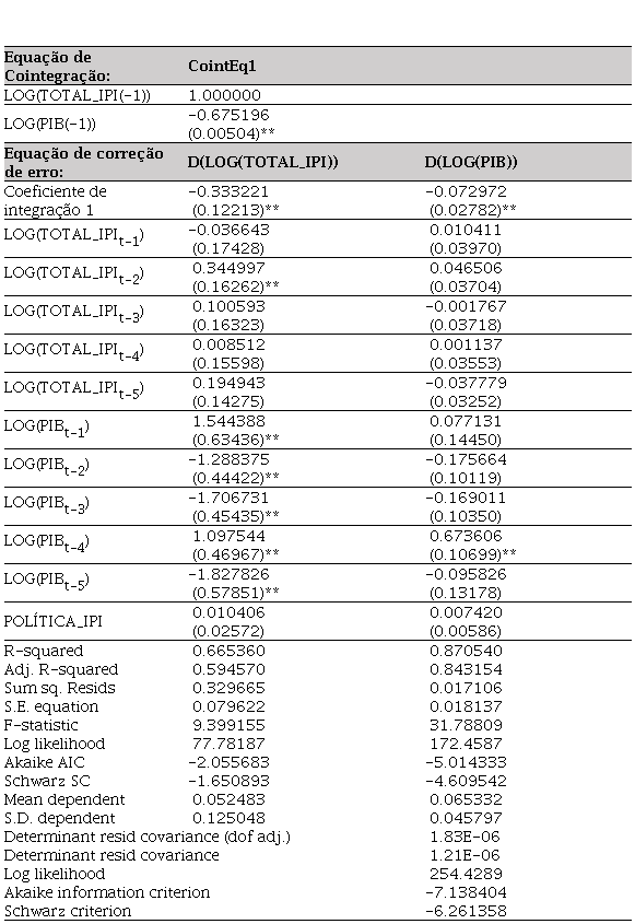 Assim, as variações do IPI foram explicadas considerando, além dos desequilíbrios de curto prazo, apenas pelo seu valor defasado em dois períodos e as cinco defasagens do PIB aplicadas no modelo. O PIB, por sua vez, foi explicado apenas pelo seu valor defasado de quatro períodos, podendo ser referente aos efeitos cíclicos, uma vez que são considerados períodos trimestrais nas variáveis e, quatro defasagens correspondem a um trimestre equidistante um ano, correspondendo ao mesmo período do ano anterior.
