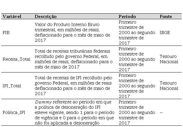 Foram utilizados dados trimestrais iniciando no primeiro trimestre de 2000 e finalizando no segundo trimestre de 2017, contabilizando 70 observações. Tal período consiste naquele que possui dados disponíveis para as receitas públicas federais e produção econômica, sendo o início da série para receitas janeiro de 1999 e de PIB no primeiro trimestre de 2000.
