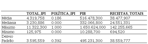A análise descritiva dos dados pode ser observada na Tabela 2. Ao todo, foram consideradas 70 observações, contando do primeiro trimestre de 2000 ao segundo trimestre de 2017. Os valores mínimos do Total_IPI, PIB e Receitas_totais correspondem ao mesmo período, o primeiro trimestre de 2000, enquanto os valores máximos do Total_IPI e Receitas_totais correspondem ao último trimestre de 2016. Já o maior valor do PIB foi correspondente ao segundo trimestre de 2017.