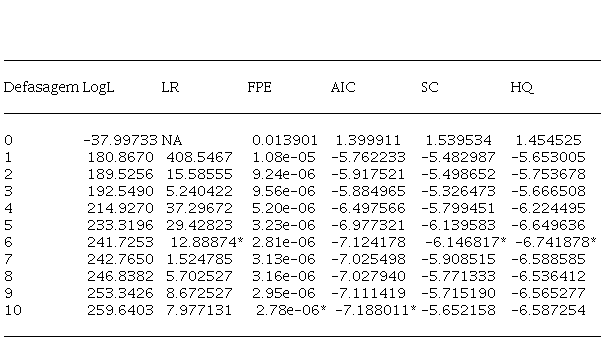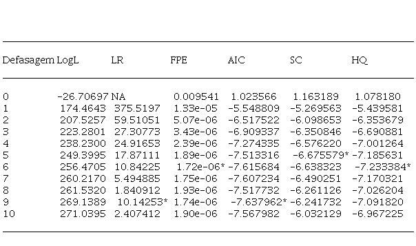 Assim, será verificado o nível de defasagem a ser escolhido para o modelo conforme os critérios da Estatística do teste modificado de LR, de Final prediction error, critério de Akaike, critério de Schwarz e critério de Hannan-Quinn. Nesse caso será selecionado o valor mais parcimonioso, conforme o que for indicado a partir desses critérios.