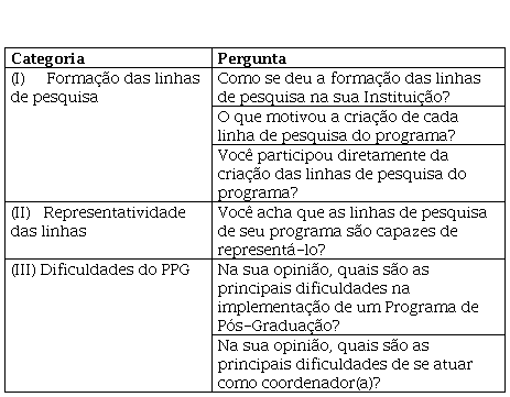 O instrumento da pesquisa foi realizado em três blocos (formação e criação das linhas de pesquisa; representatividade das linhas; e dificuldades do PPG). As variáveis de constructo resultaram da própria pesquisa, em virtude do tema a ser abordado ser exploratório.