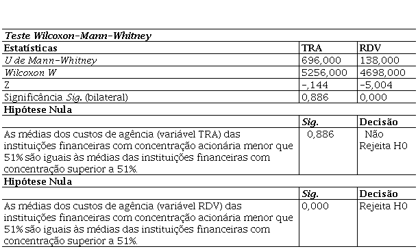 No que se refere às companhias com participação acionária acima de 51% e as instituições com participação menor que 51%, o teste de médias de Wilcoxon-Mann-Whitney apontou médias iguais no que concerne à variável TRA; dessa forma, não há como distinguir qual das companhias apresenta maiores custos de agência. No que diz respeito à variável RDV, as companhias com participação maior que 51% demonstram maiores despesas discricionárias e, portanto, maiores custos de agência. Assim, conclui-se que as empresas com participação acionária maior que 51% revelam maiores custos de agência. Dessa forma, não é rejeitada a hipótese 3.